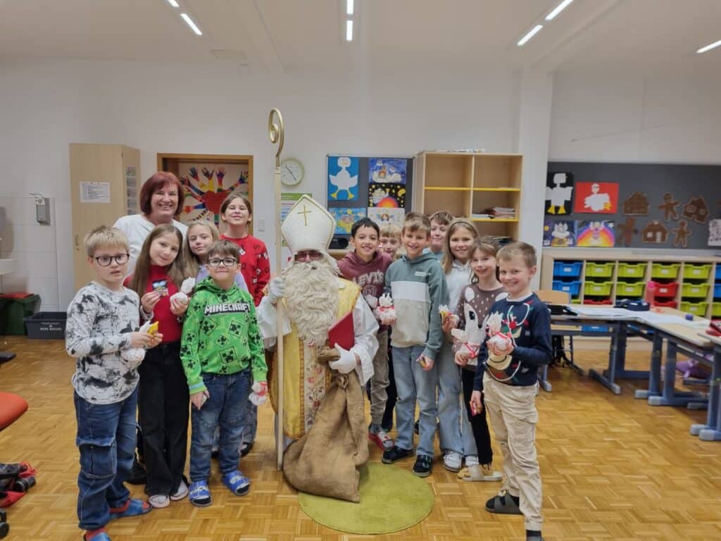 Der Nikolo hatte auch etwas mitgebracht: kleine Geschenke und liebe Worte für die Kinder. Die Freude war groß, und der Besuch sorgte für eine fröhliche und festliche Stimmung in der ganzen Schule.